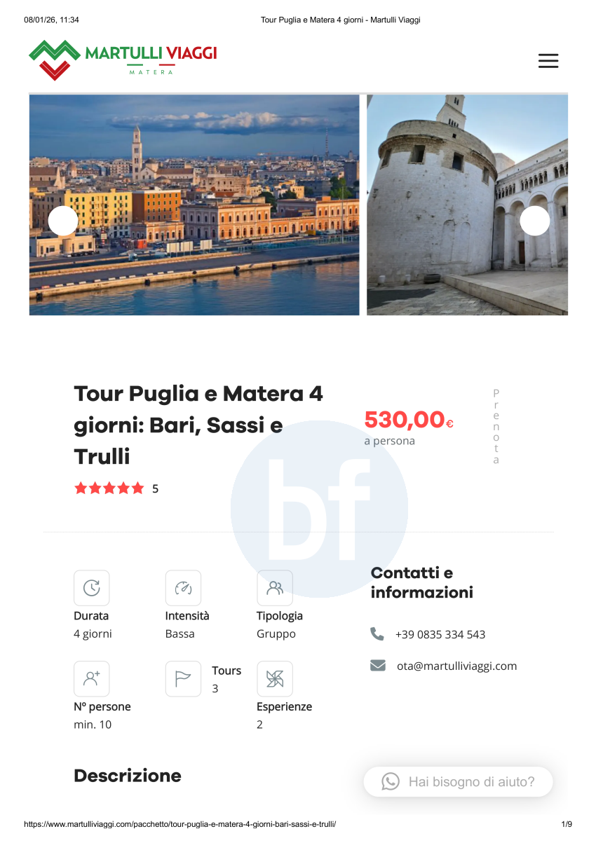 Tour Puglia e Matera 4 giorni: Bari, Sassi e Trulli