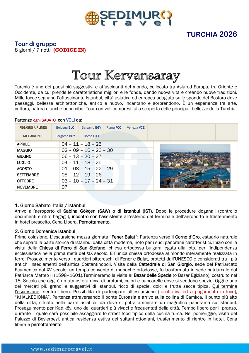 Tour Kervansaray con volo da BGY, BLQ, FCO e VCE ogni sabato 8 giorni